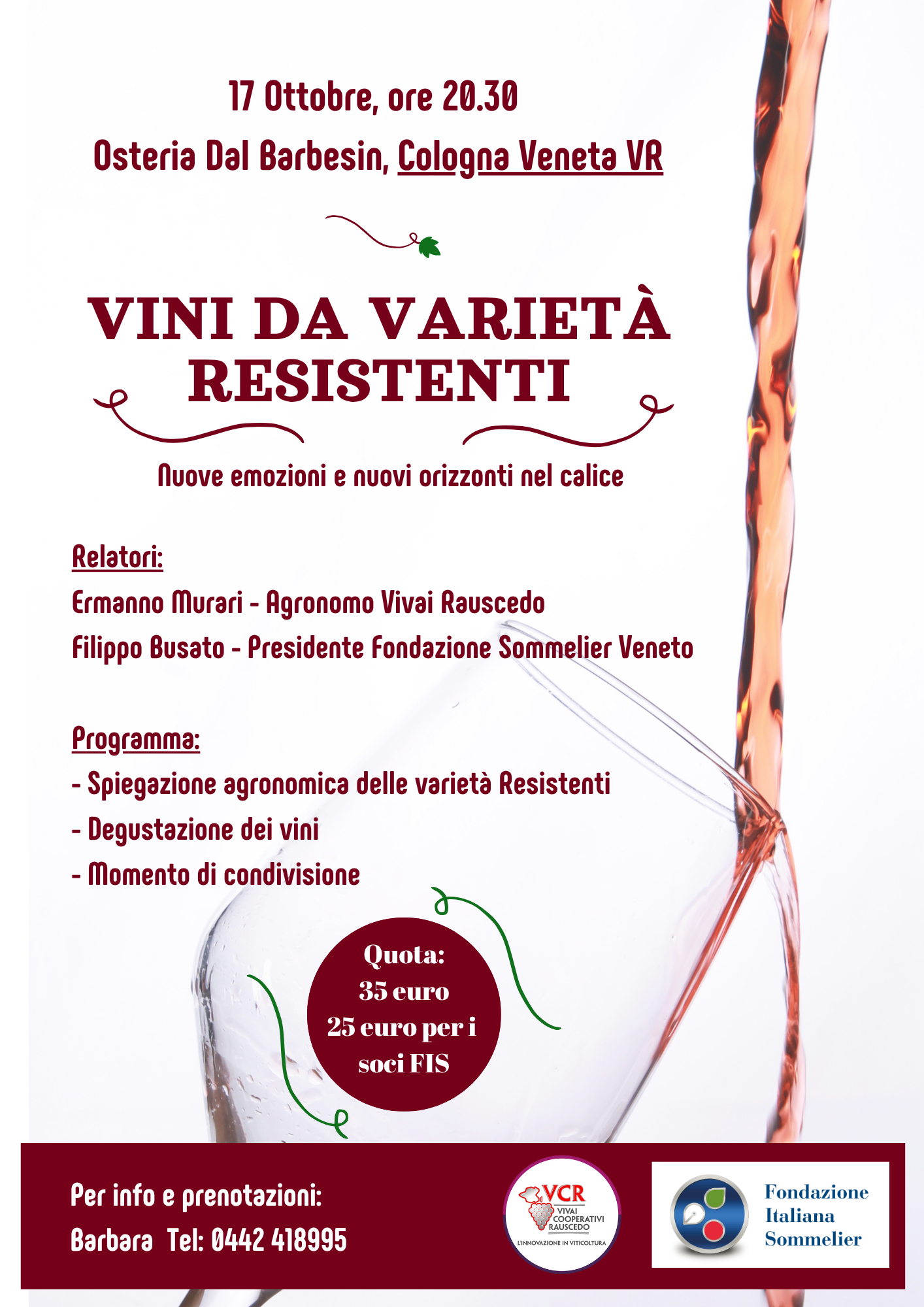 Nel corso della serata andremo alla scoperta delle varietà resistenti con i professionisti di Vivai Rauscedo e della Fondazione Sommelier Veneto.