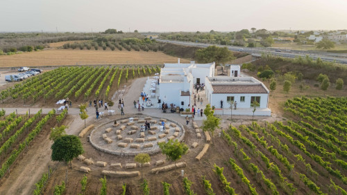 La cantina di produzione opera a Bagnolo del Salento. Accanto ai filari, l’orto-vigneto e un giardino aromatico ricco di erbe officinali e fiori campestri, un piccolo allevamento di animali da cortile, l’aia circolare utilizzata come spazio per le wine experience
